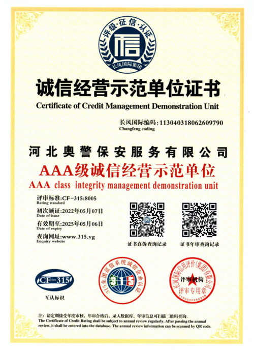 “忠誠的伙伴,非凡的朋友”,河北奧警保安服務有限公司本著“客戶的需求就是我們的追求”的服務理念,與廣大客戶攜手并進、共創(chuàng)恢弘偉業。